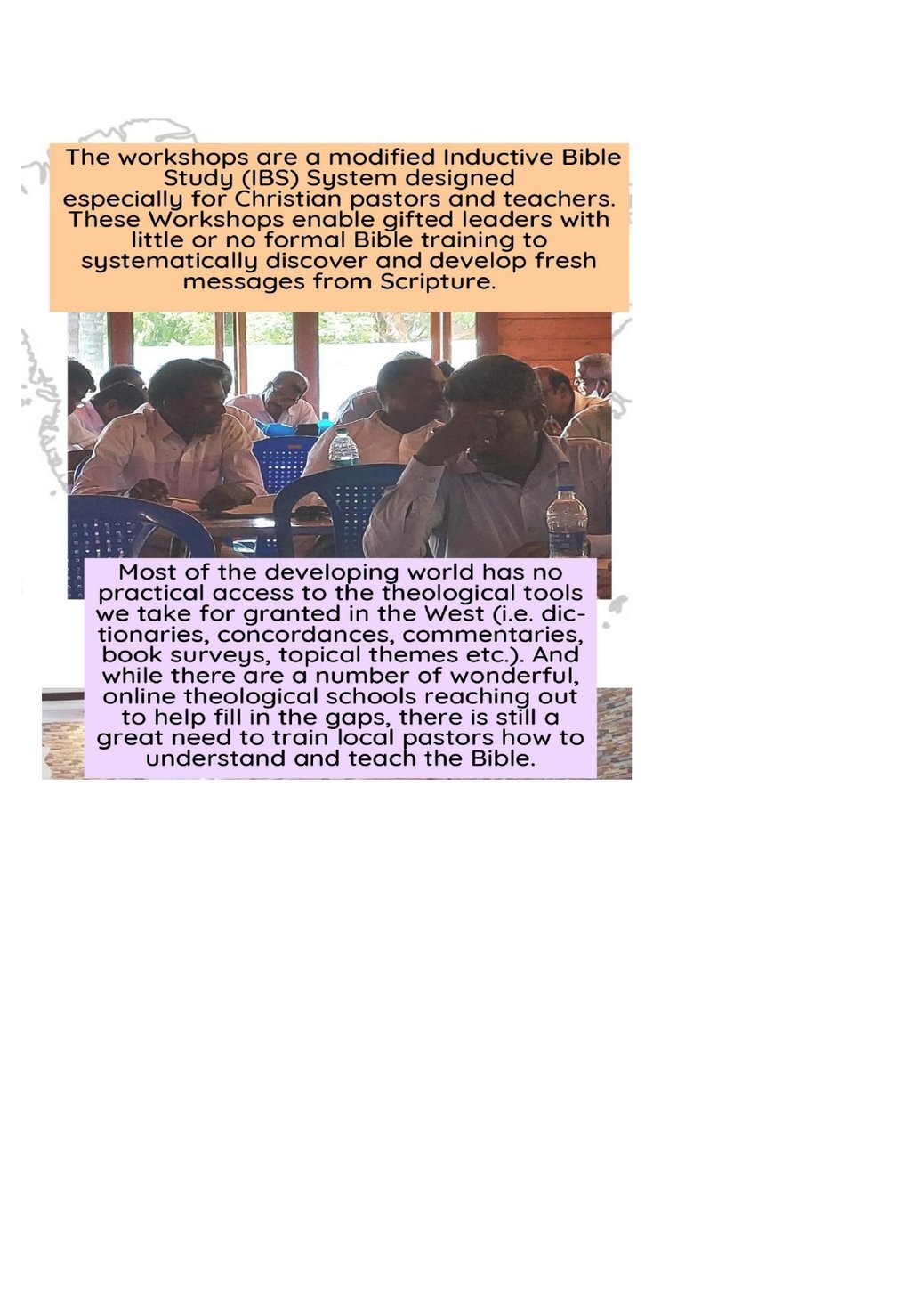 The Bridge Teacher Training Workshop In this local workshop pastors and teachers sharpen their skills and learn how to: • Effectively discover Insights from God's Word • Find the principles woven into each passage • Determine the underlying message • Choose the angle of study • • Evaluate the historical/literary contexts • • Effectively discover Insights from God's Word • Apply observation skills by asking questions • Analyze the results • Choose the purpose/direction of application • Locate and apply universal principles pp • • Follow biblical teaching patterns • Confidently work through the text at hand • • Combine the best study method skills • Provide crossover segues for new visitors • • This free in-country workshop is part of the Bridge Workshop teacher training curriculum and is currently under translation in Tamil, French, Spanish, Tagalog and Amharic.